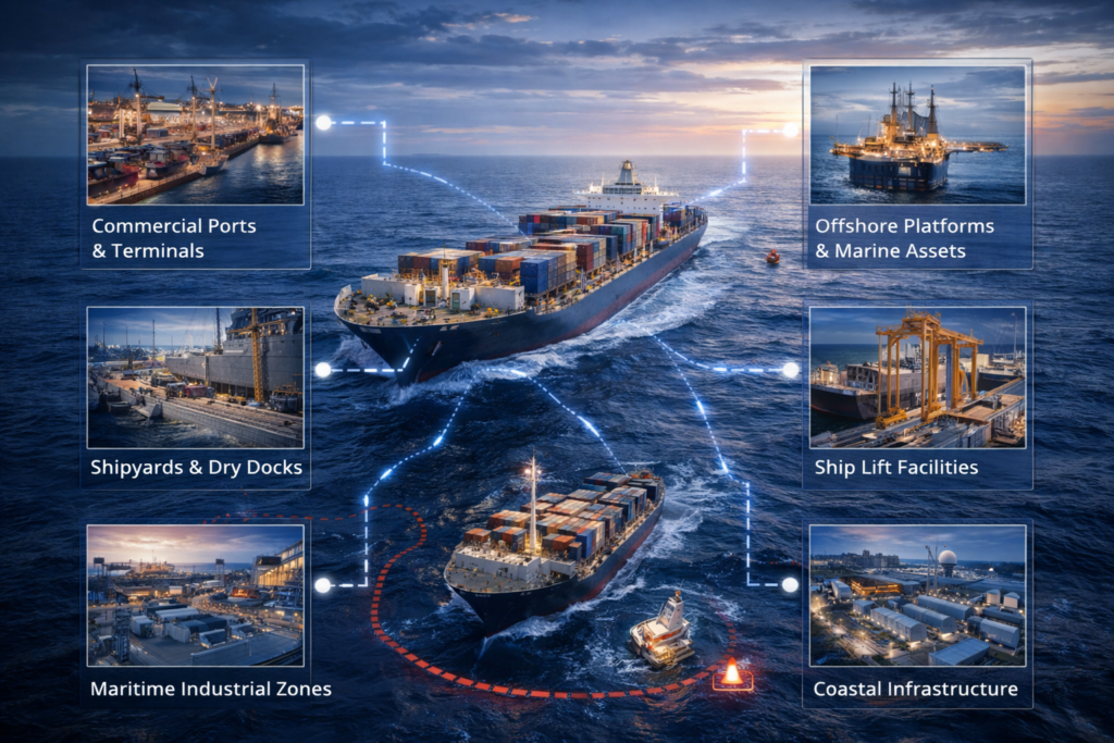 Marine and offshore facilities operate in complex, high-risk environments where safety, asset protection, and operational continuity are critical. Our solutions are designed to address the unique challenges of maritime infrastructure—large open perimeters, vessel movements, environmental exposure, and 24/7 operations.